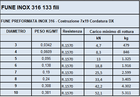 Cavo in acciaio inox 316 costituito da 7 trefoli di 19 fili ciascuno.