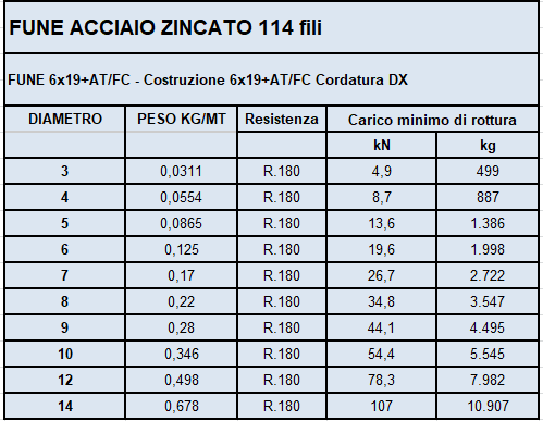 Galvanized steel rope consisting of 6 strands of 19 wires each + internal fiber core. Extremely flexible rope.