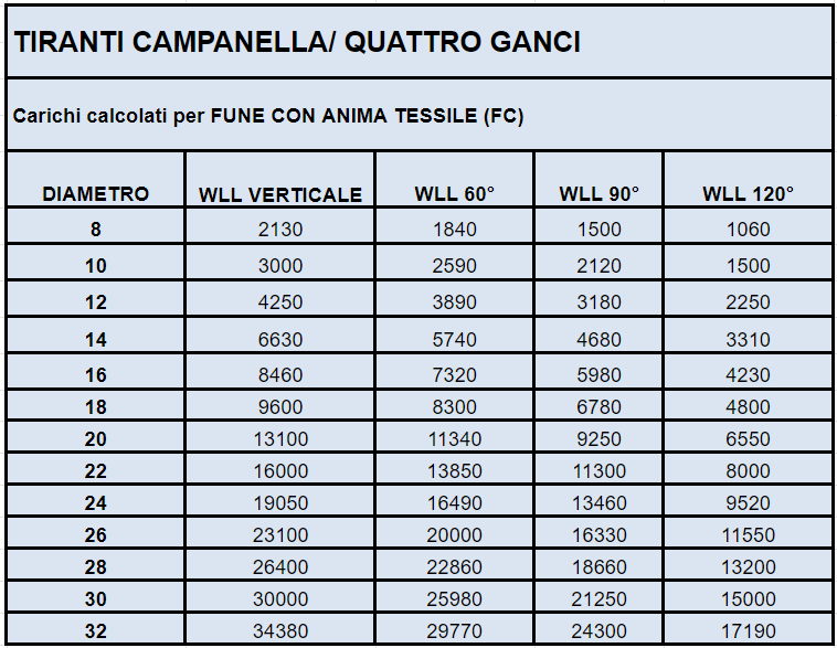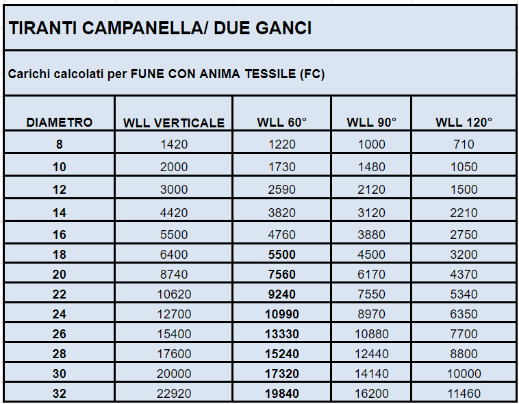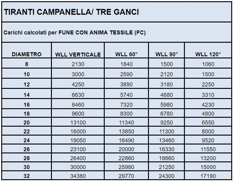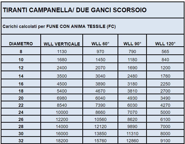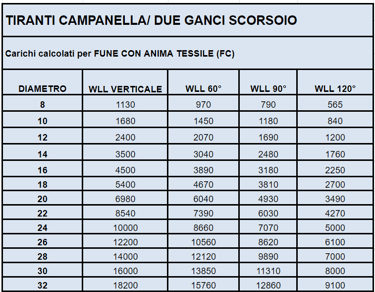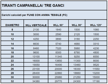 Important: for three-leg slings, it is not possible to refer to the angle at the top but it is necessary to refer to double the angle of inclination of the legs with respect to the vertical
